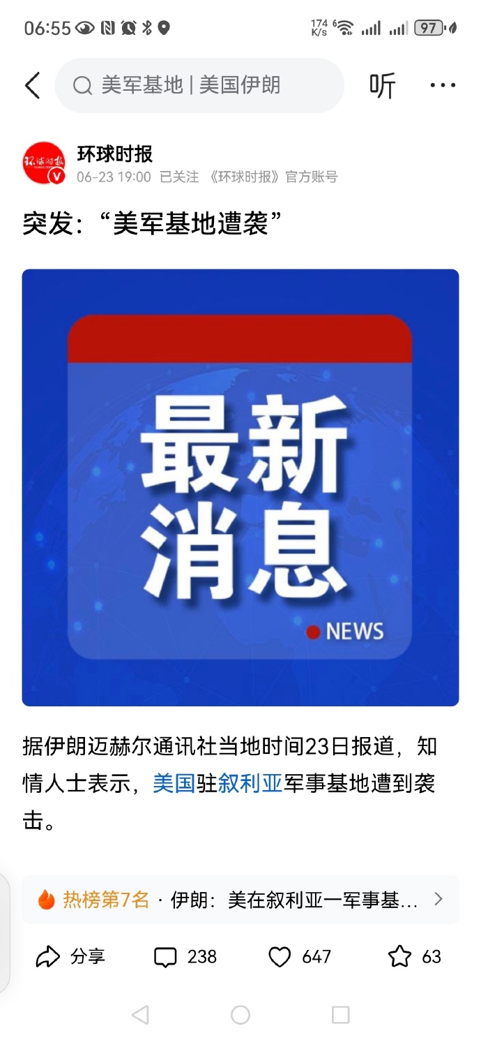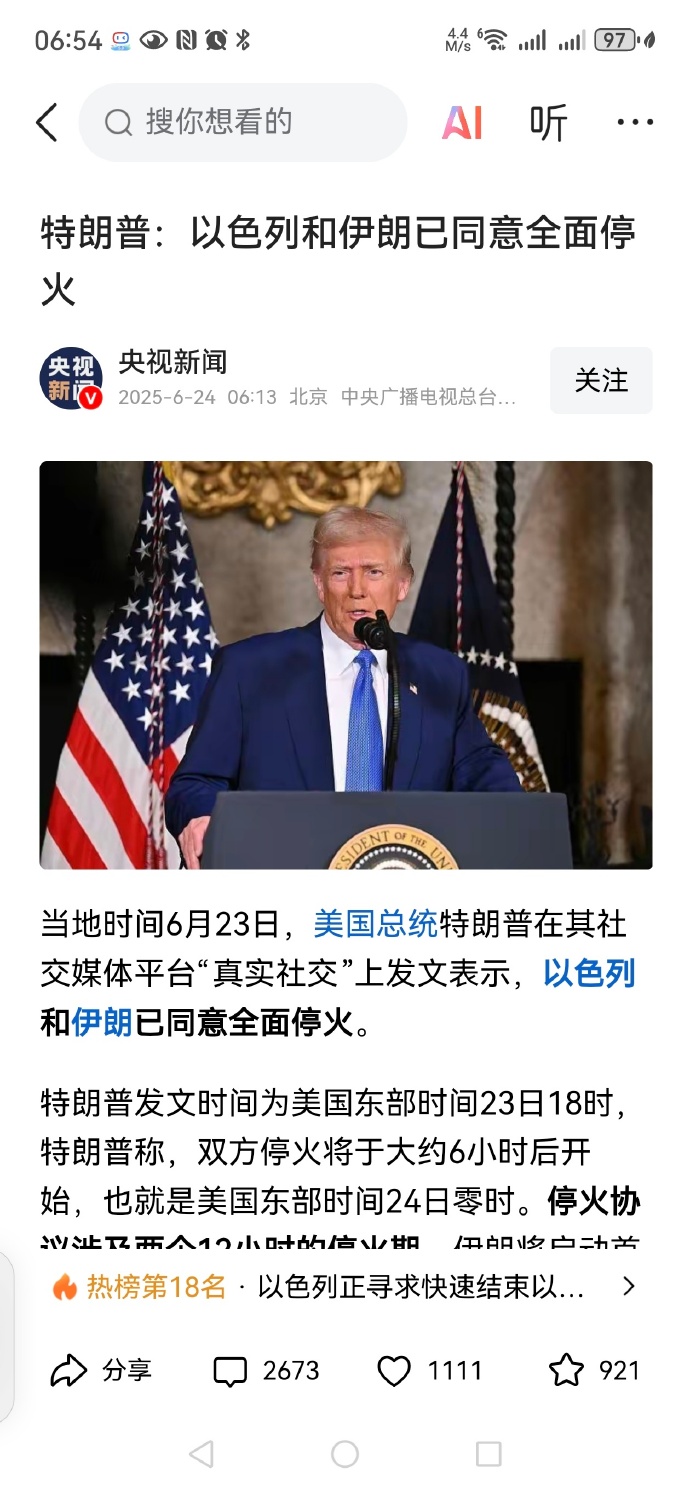 一大早起來看新聞,有兩條新聞挺有意思,一條是特朗普發文説以色列和伊朗同意停火。一條是美國卡塔爾、伊拉克的基地被伊朗攻擊。