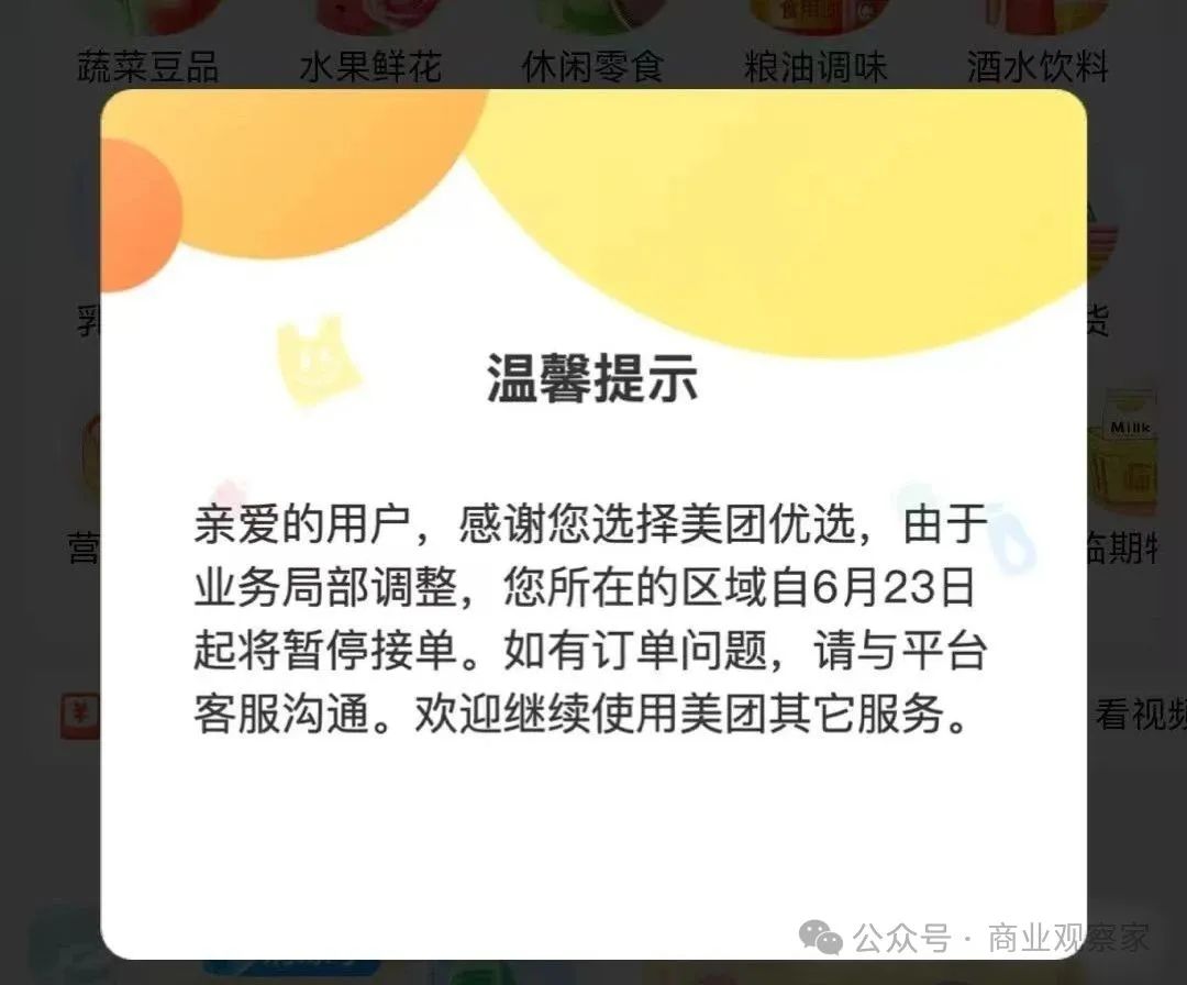 《商業觀察家》看到,美團優選頻道已經從美團APP首頁消失。搜索“美團優選”,服務頁面則跳出温馨提示對話框“親愛的用户,感謝您選擇美團優選,由於業務局部調整,您所在的區域自6月23日起將暫停接單。”