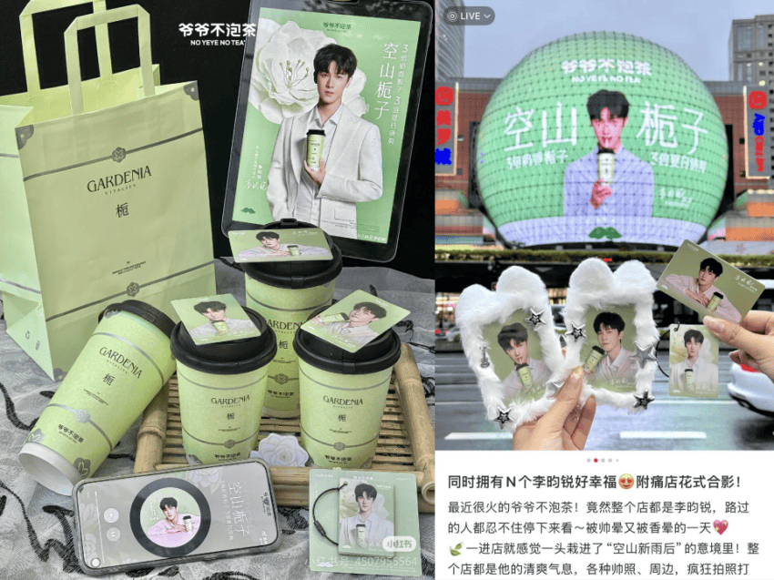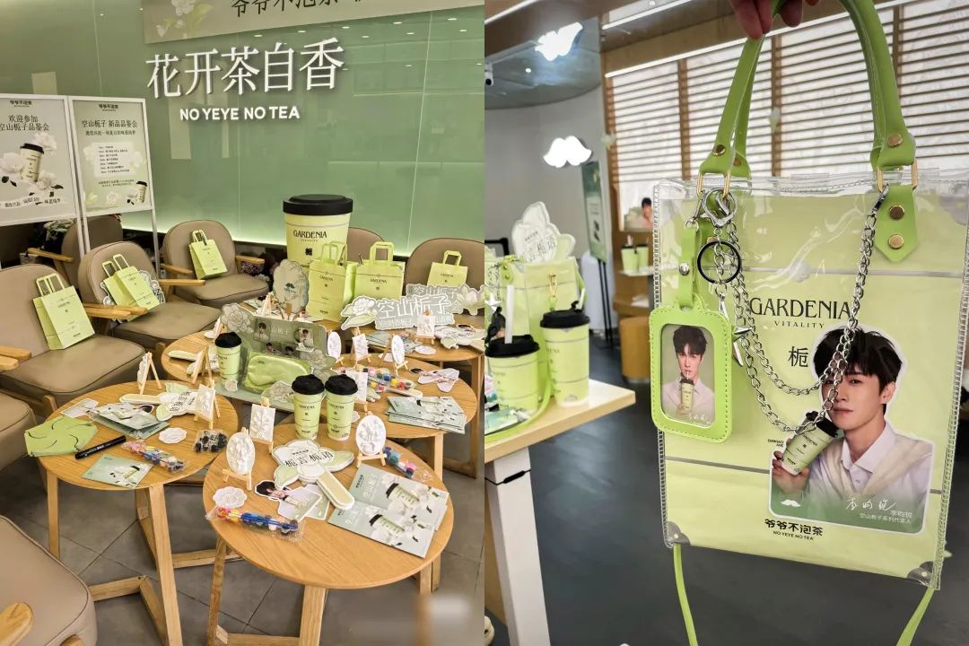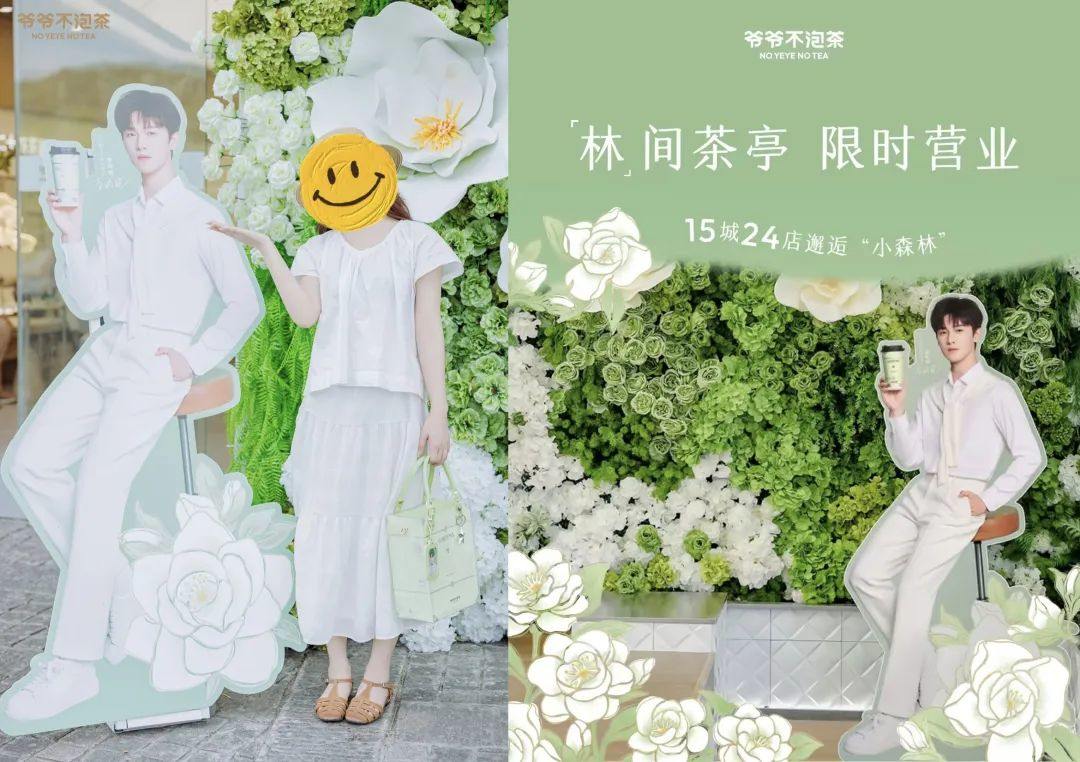 比如“空山梔子”升級迴歸之際,爺爺不泡茶在15座城市的24家門店同步打造了限時“林間茶亭”主題空間,巨型代言人立牌、主題背景牆等。在這方為代言人李昀鋭粉絲“小森林”們量身定製的天地裏,粉絲們可以悠然品嚐“空山梔子”,參與互動問答贏取限量周邊,更能在精心設計的打卡裝置中沉浸式體驗“被李昀鋭包圍”的專屬氛圍。
