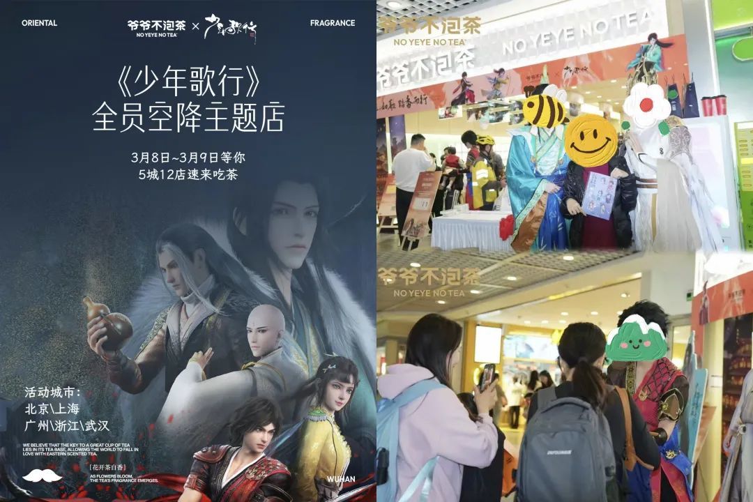 今年3月初,爺爺不泡茶和人氣國漫《少年歌行》聯名期間,也打造了一批主題店,吸引大量國漫粉絲到店打卡,通過參與現場互動環節,粉絲們可以親自DIY填字掛件,還能獲得貼紙、徽章、鐳射票等豐富周邊禮品。