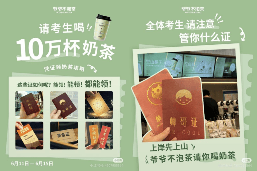 高考季,爺爺不泡茶化身“解壓搭子”。今年高考期間,爺爺不泡茶推出“10萬杯奶茶送考生”活動,消費者可以憑“證”領“空山梔子”。