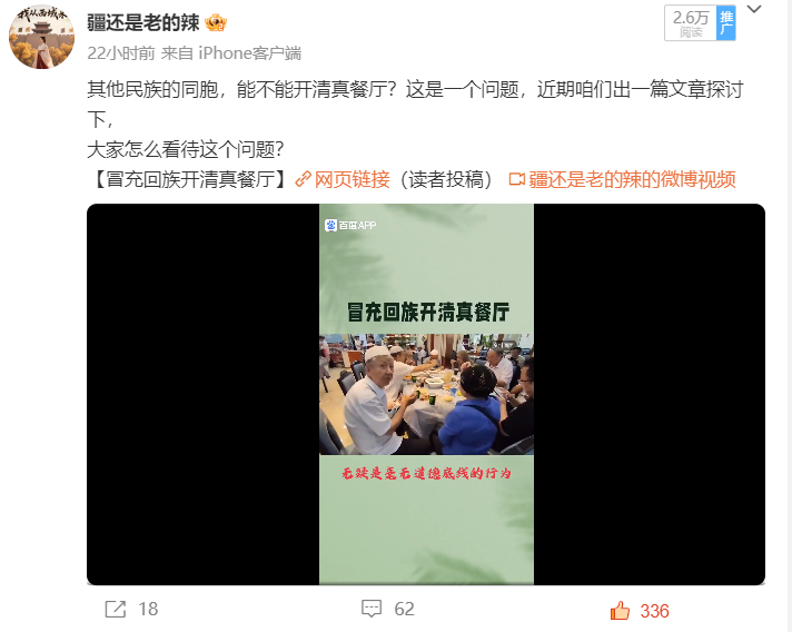 視頻裏講的是“冒充回族開清真餐廳”,但它真正批判的,不是食品安全、不是宗教侮辱,而是一種對“身份歸屬”的越界——好像“清真”這兩個字,只能被特定民族“持有”。