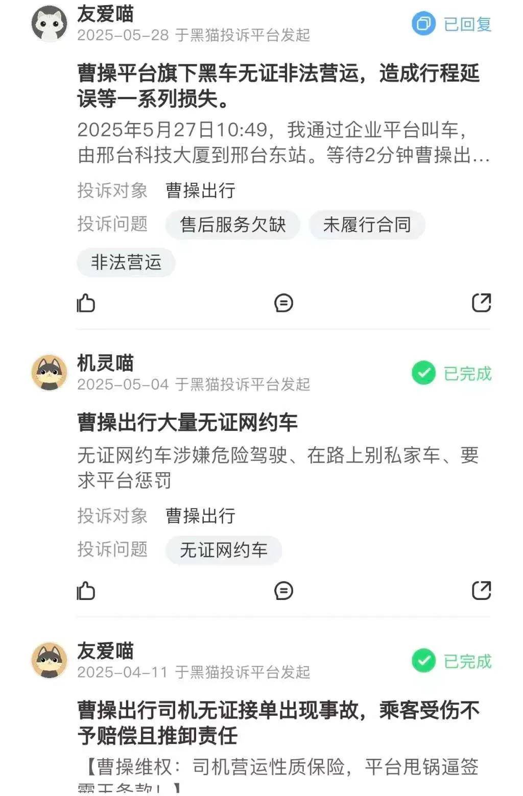 作為出行服務平台,合規性是保障用户安全和服務質量的關鍵。然而,曹操出行在這方面卻表現不佳。交通運輸部發布的數據顯示,在4月份訂單量前10名的平台中,曹操出行訂單合規率排名第8。黑貓投訴平台上,曹操出行相關投訴高達1.13萬條,其中司機無證運營問題尤為突出。招股書顯示,2022 - 2024年,曹操出行平台上一直存在大量未取得運輸證的車輛和未取得網絡預約出租汽車駕駛員證的司機。例如,2024年10月,592346輛活躍車輛中有50942輛未取得運輸證,590583名活躍司機中有65555名未取得駕駛員證。