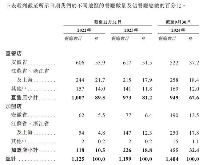 2016年前,老鄉雞專注於安徽市場,以直營模式打磨單店模型,2019年門店突破800家。2020年開放加盟,門店數從2022年的1125家門店數量激增至2024年9月的1404家,其中加盟店佔比從10.5%升至32.4%,3年增長286%。