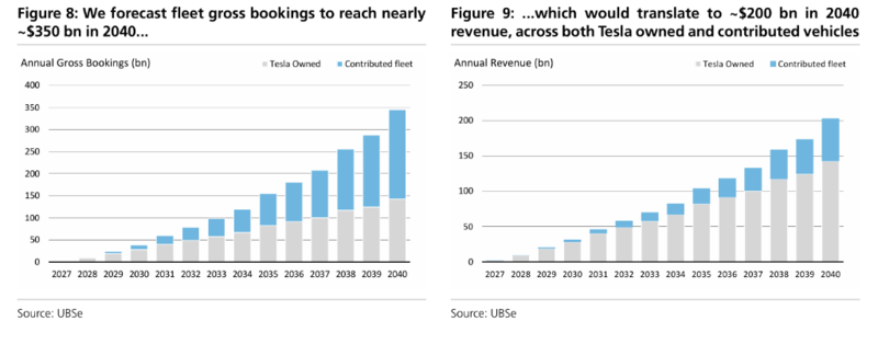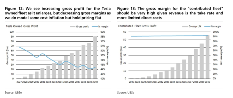 瑞銀預計,屆時Tesla Network的總年營收可達2030億美元,其中自營車隊貢獻1430億美元,貢獻車隊貢獻約600億美元(按30%平台抽成計),整體毛利率高達72%,淨利潤率為42%。
