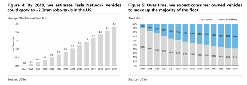 瑞銀團隊以奧斯汀為例,分析了特斯拉即將啓動的首個Robotaxi服務,並基於保守假設對其進行了15年期的商業建模。模型顯示,到2040年,Tesla Network的Robotaxi車隊可能達到230萬輛,涵蓋自營車輛與外部“貢獻”車輛兩種類型。