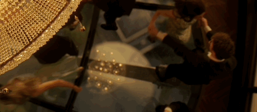 香檳酒蓋擊中吊燈,頭部尖鋭的水晶裝飾掉落,將天景舞池地板刺出裂痕。