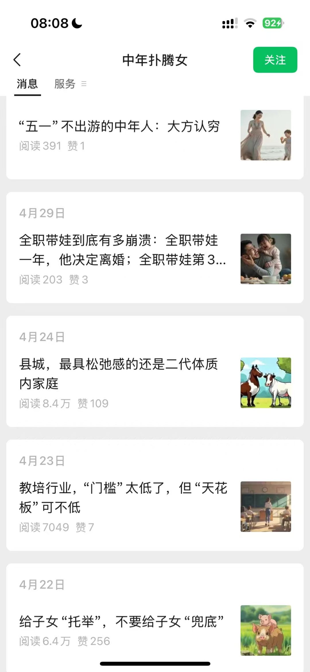 子中給我看了一個Case,這個名為“中年撲騰女”的賬號,每次發的文章基本都是幾段話展開的輕內容,很顯然是一個非專業的素人作者。