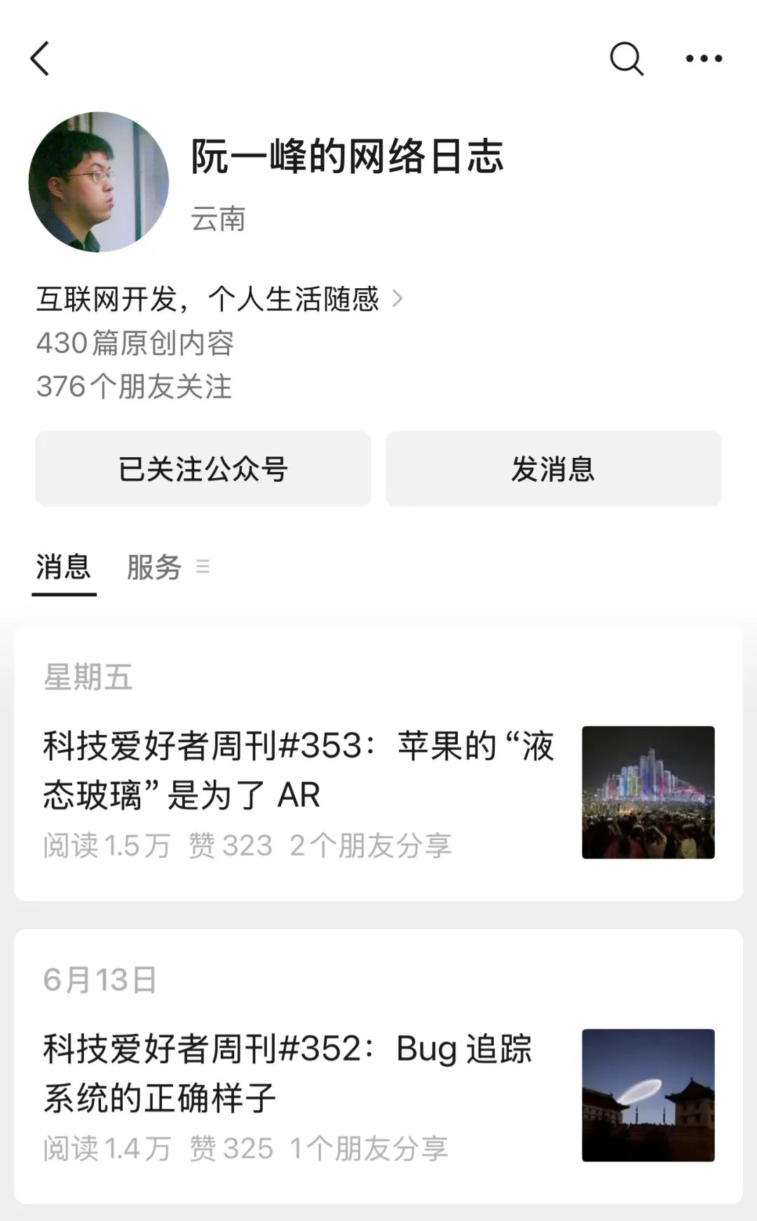 作為科技作者的活化石,阮老師在2018年開始更新他的“科技愛好者週刊”,每週五準時發佈,連續7年總共353期從未間斷,如同行為藝術。