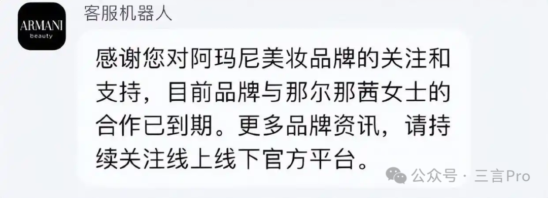 店鋪的機器人客服回應稱:目前品牌與那爾那茜女士的合作已到期。阿瑪尼品牌沒有公開發布合約到期的消息,不過其公眾號和微博最近發佈那爾那茜的信息都是在今年2月。