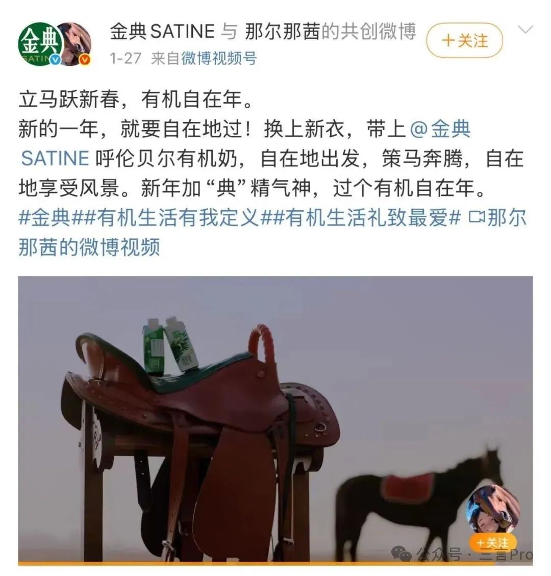 金典微博搜不到那爾那茜,但二者共創的微博還在,可能因為文案中沒有那爾那茜四個字。