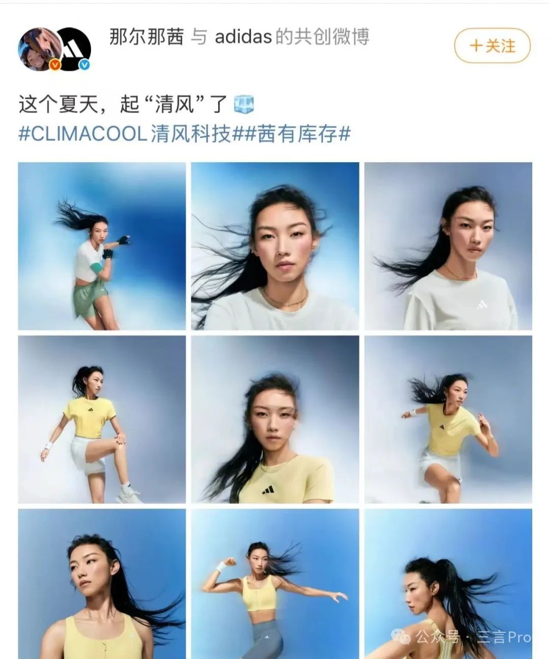 那爾那茜今年成為阿迪達斯品牌代言人,在5月1日與adidas共創了微博,三言Pro發現,這條共創的微博在adidas官微消失了。