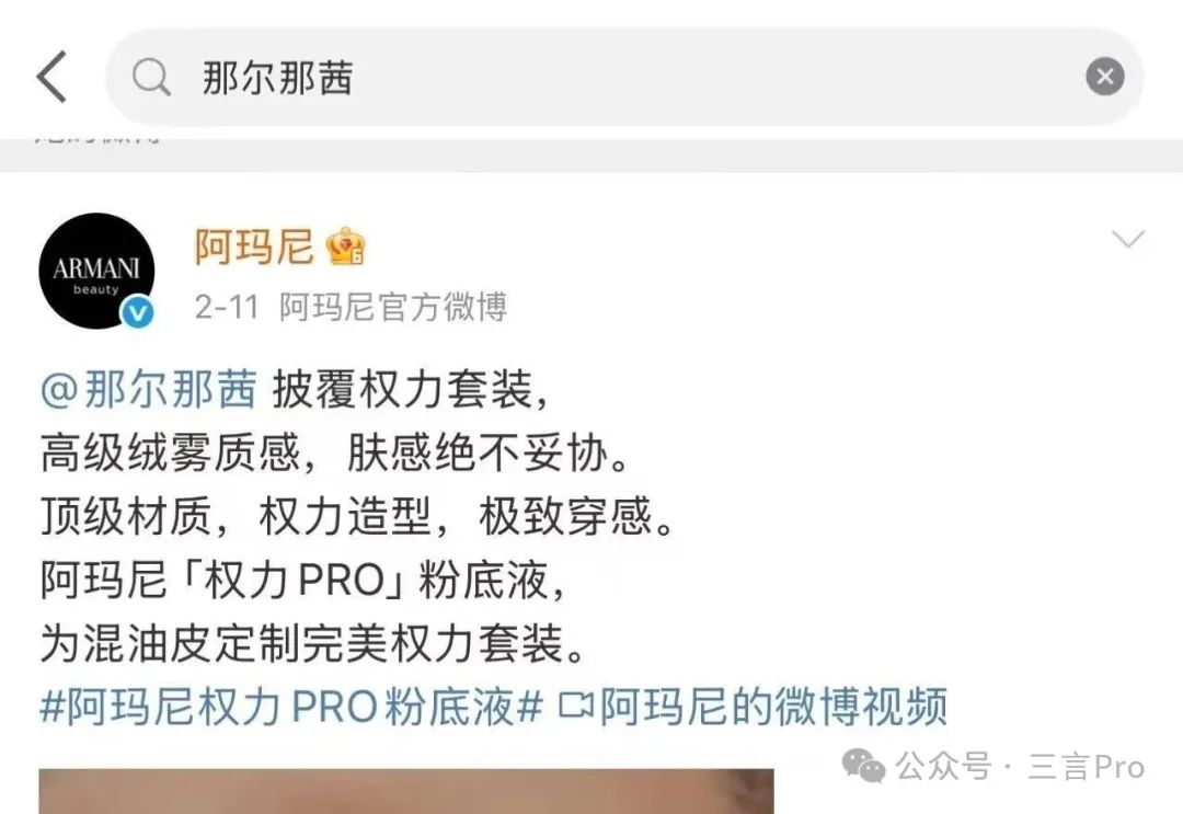 那爾那茜還曾與阿瑪尼合作,成為其品牌摯友,阿瑪尼多條關於她的微博還在。
