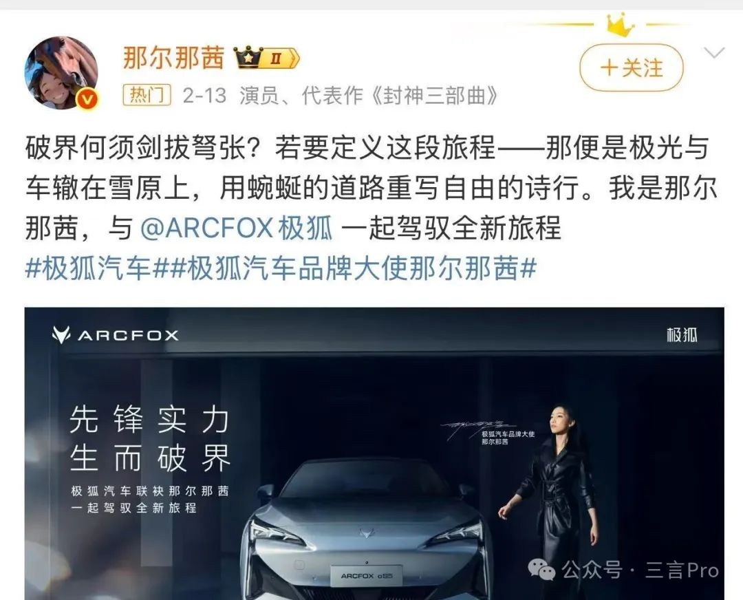 今年2月,那爾那茜成為極狐汽車的品牌大使,宣傳語是"先鋒實力,生而破界"。