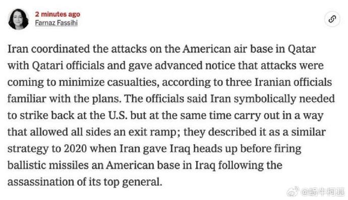 伊朗與卡塔爾官員協調對美國駐卡塔爾空軍基地的襲擊,並提前通知,以儘量減少人員傷亡。