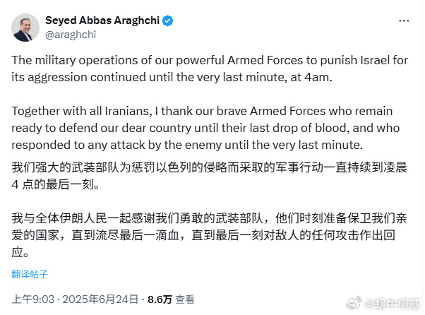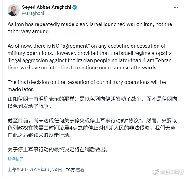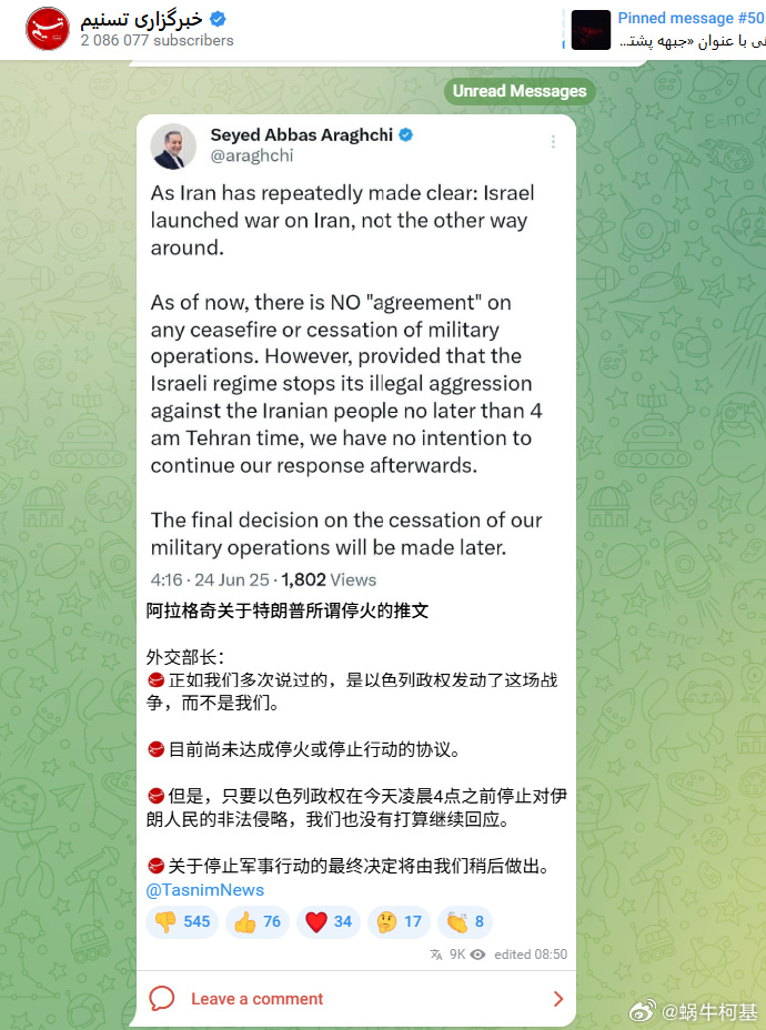 塔斯尼姆通訊社也轉載了伊朗外長的聲明,這就是實質性停火。其實從昨晚表演性的打擊美軍基地就能判斷啊,伊朗想停,所以整一個秀……政治性的軍事表演都出現了,不明白為什麼一堆人覺得伊朗不會停。