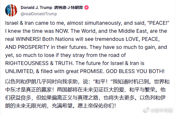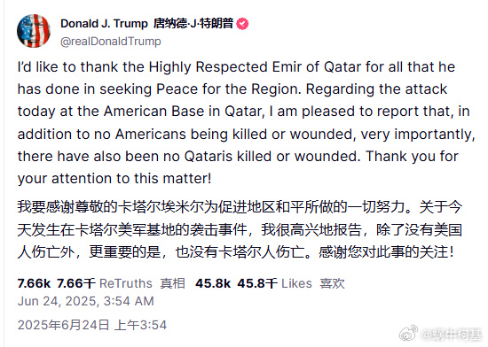 特朗普先感謝伊朗打擊美軍基地前通知了美國怎麼防範,隨後稱伊以將正式停火,這場持續12天的戰爭將結束。