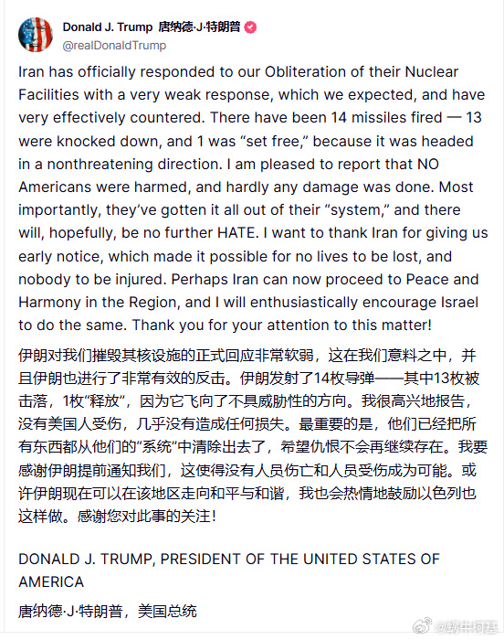 無語,伊朗導彈的大耳光都抽上來了,特朗普還在發帖説和平已到