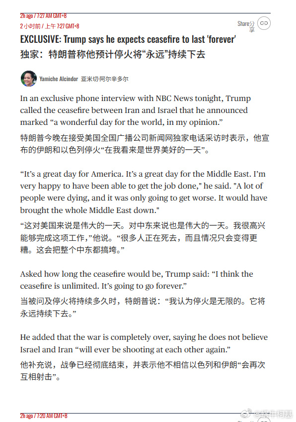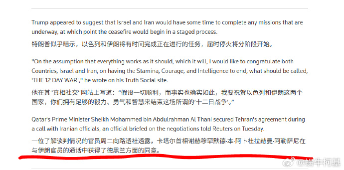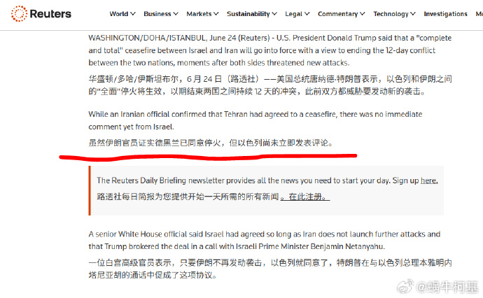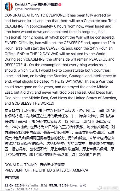 • 特朗普宣佈停火,含糊地暗示將於東部時間凌晨12點開始(北京時間12點)