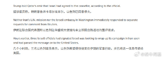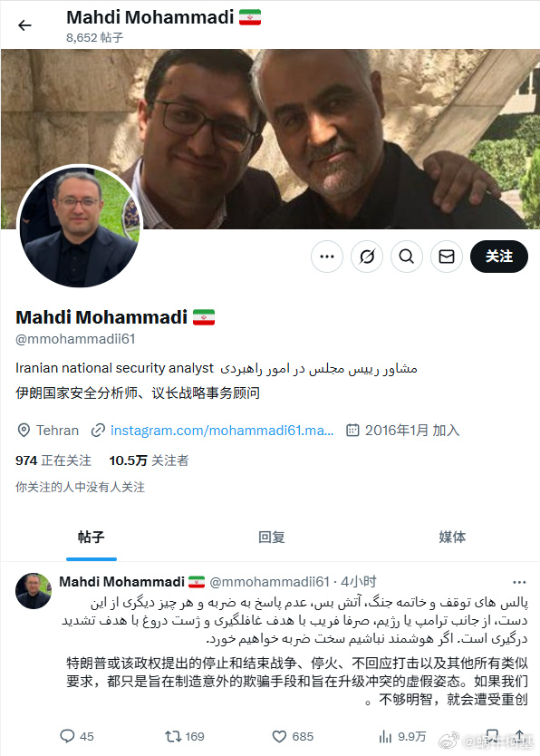 除了外長的發帖,伊朗確實沒有任何官方表態,而法爾斯通訊社、梅爾通訊社均報道了伊朗議長顧問在停火前發文説不可能停火,這都是騙局的推文。