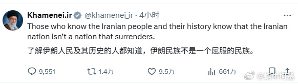 四小時前,就在特朗普剛發慶祝和平,但還沒有提雙方停火時候説哈梅內伊發帖説伊朗不會投降
