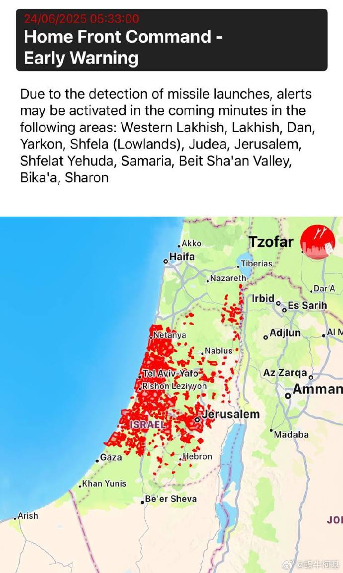 • 隨後以色列對德黑蘭發動大規模攻擊,直至北京時間 8:29。