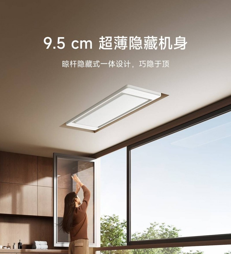 米家智能晾衣機2Pro擁有突破行業常規的9.5cm超薄一體化機身,比競品平均10-13cm的機身更顯輕盈,完美融入現代家居風格,猶如天花板上的藝術品。無論是小户型的緊湊陽台,還是大平層的奢闊空間,皆能以極簡設計勾勒高級感。