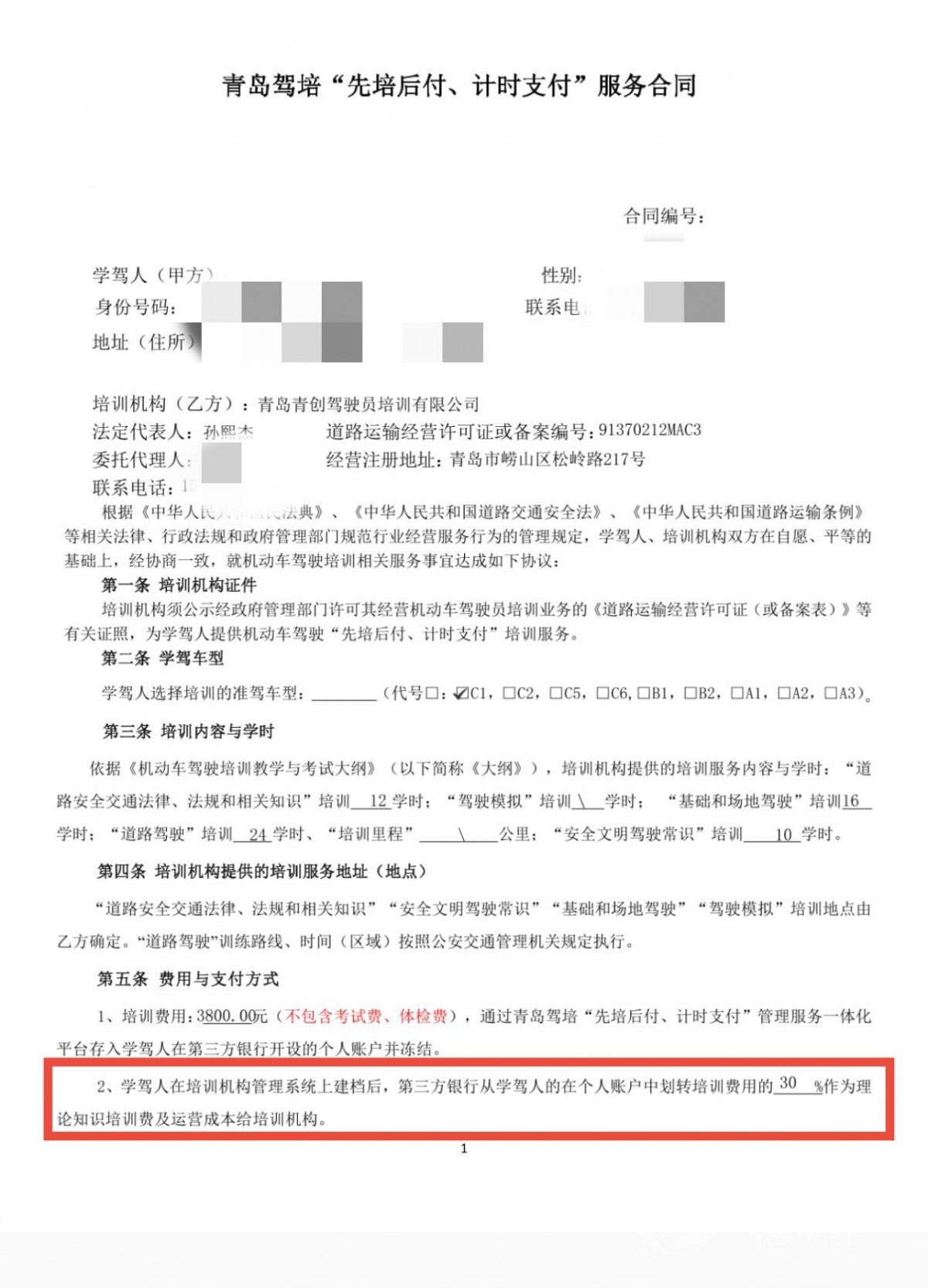 平台統一制式合同。(來源:受訪者)信網6月24日訊 “端午假期回來之後就突然關門了,教練也説被拖欠了三個月工資。”近日,在青島青創駕駛員培訓有限公司(以下簡稱“青創駕校”)報名學車的學員馮女士向信網(熱線0532—80889431)反映,青創駕校突然關門,沒有場地練車,也聯繫不上校長,一時間讓數百名學員慌了神。