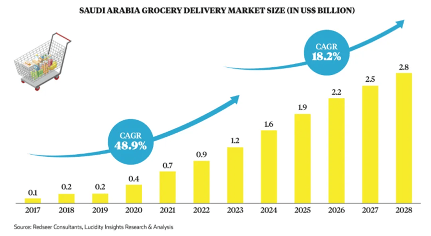 Lucidity Insights的報告也顯示,到2028年,沙特食雜配送市場規模預計將以18.2%的複合年增長率增至28億美元,該增長率是餐飲配送市場的3倍。