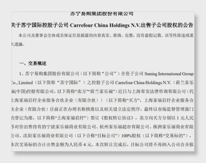 近日,一則“蘇寧易購4元出售4家家樂福子公司”的消息引發市場廣泛關注。在大眾認知裏,商業交易動輒涉及鉅額資金,而此次4元的交易金額實在令人大跌眼鏡,充滿戲劇性,這背後究竟有着怎樣的商業考量與戰略佈局?