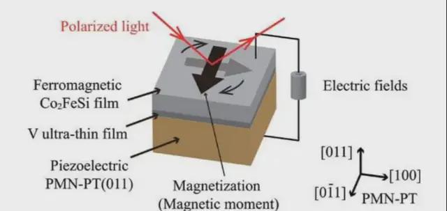 Co2FeSi/V/PMN-PT(011)異質結構示意圖。電場垂直施加於Co2FeSi/V/PMN-PT異質結構平面。(來源:Advanced Science)