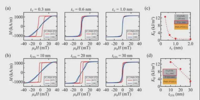 圖(a) 和 (b) 分別為 Co2FeSi(30 nm)/V(tV nm)/PMN-PT(011) 和 Co2FeSi(tCFS nm)/V(0.6 nm)/PMN-PT(011) 條件下不同 tV 和 tCFS 的室温代表性磁致伸縮 (MH) 曲線。圖 (c) 和 (d) 分別為估算的 Kg 與 tV 和 tCFS 的關係。(來源:Advanced Science)