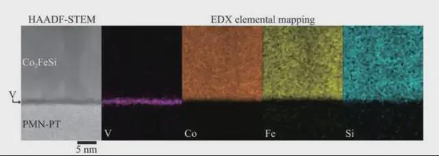 Co2FeSi/V/PMN-PT(011)異質結構的高角度環形暗場掃描透射電子顯微鏡 (HAADF-STEM) 圖像和能量色散X射線能譜 (EDX) 元素圖,其中區域軸為 PMN-PT[100]。(來源:Advanced Science)