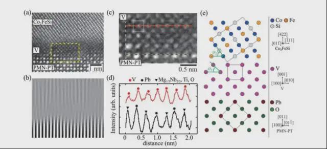 此外,掃描透射電子顯微鏡(STEM) 分析揭示了異質結構的原子結構。這些圖像揭示了 Co2FeSi 層和 PMN-PT 層之間清晰均勻的界面,凸顯了釩插入在促進外延生長方面的有效性。