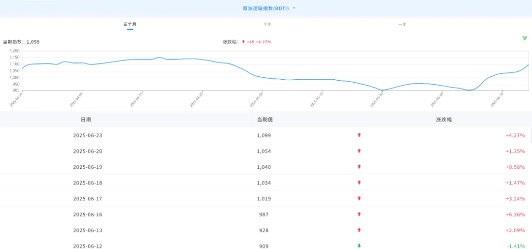 船視寶航運指數顯示,近幾日的原油運輸指數(BDTI)持續上漲,昨日上漲了4.27%。
