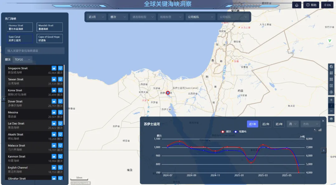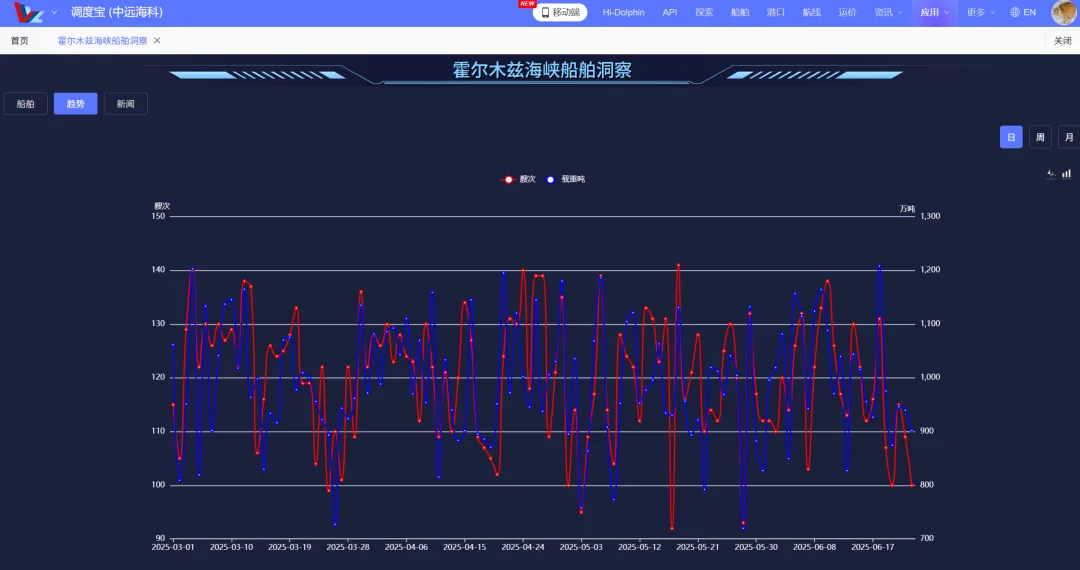 用户可以即時查看當前通過霍爾木茲海峽的所有船舶,以及24小時內曾經過往的船隻。海峽的船舶艘次、載重噸也以圖表的形式展示出來,趨勢變化一目瞭然。