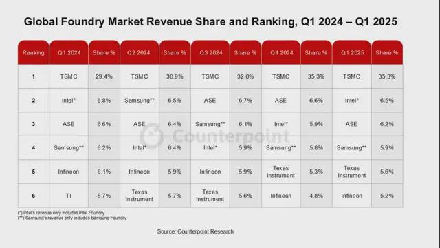 談到晶圓代工市場份額,副總監 Brady Wang表示:“台積電處於領先地位,其市場份額增長至 35%,並實現了 30% 左右的同比增長,這得益於其在尖端工藝和大量AI芯片訂單方面的強勢地位。英特爾和三星晶圓代工落後,英特爾憑藉 18A/Foveros 獲得發展,而三星儘管正在開發 3nm GAA,但仍面臨良率挑戰。”