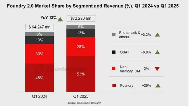 根據Counterpoint Research 的《2025 年第一季度晶圓代工收入及 UTR 按節點追蹤器》顯示,2025 年第一季度全球半導體晶圓代工 2.0 市場收入同比增長 13% 至 722.9 億美元,這主要得益於對人工智能和高性能計算(HPC) 芯片的需求激增,這刺激了對先進節點(3nm、4/5nm)和先進封裝(例如 CoWoS)的需求。