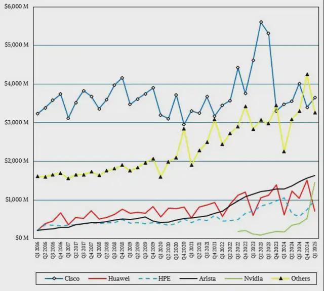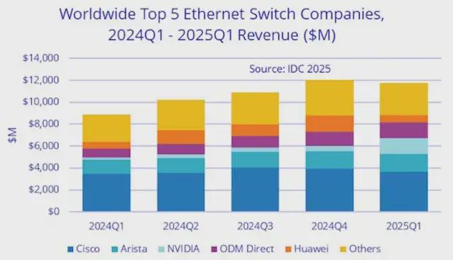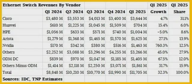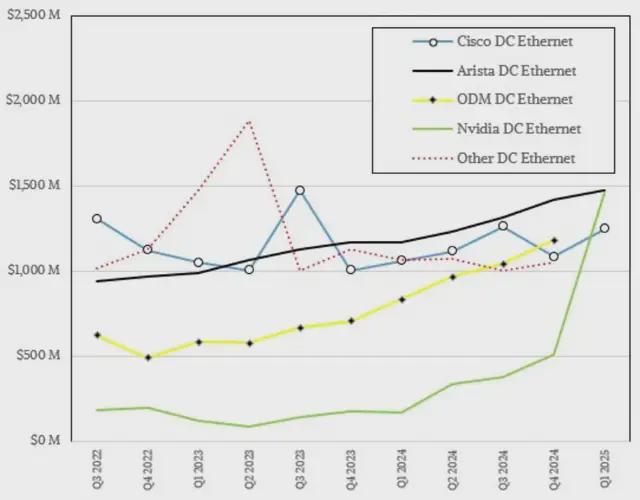 2025 年第一季度,Arista 網絡數據中心以太網交換機銷售額 14.8 億美元,同比增長 26.4%,市場份額 21.3%;英偉達以 14.6 億美元銷售額、21.1% 份額緊隨其後,延續了本文開篇提及的迅猛增長勢頭。模型顯示,思科以 12.5 億美元銷售額位列第三,同比增長 17.7%。ODM 羣體銷售額 14.1 億美元,同比增長 67.5%,但需注意該羣體包含十餘家規模化網絡設備製造商。