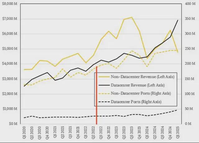 若剔除園區與邊緣業務,英偉達已緊追 Arista 網絡 —— 後者自 2023 年第四季度以來始終佔據數據中心以太網交換機銷量榜首。