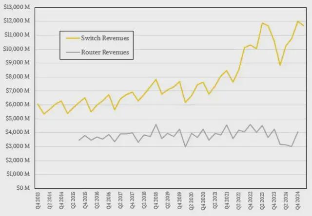 路由器市場發展相對平緩,儘管部分路由任務正逐步卸載至兼具路由功能的現代交換機(這在超大規模雲服務商、雲建設者及電信公司中較為常見,它們可自主設計硬件與路由軟件棧),但整體路由業務量在一段時間內保持穩定。而規模較小的服務提供商無力承擔此類技術任務,這也是思科與華為仍保有路由硬件業務的原因。