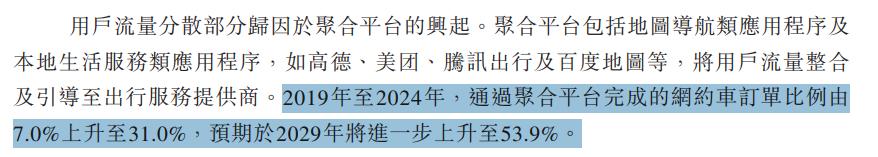 根據曹操出行披露的數據,在 2024 年有約三分之一的訂單是由高德打車、百度打車等聚合平台提供的。而這一比例在 2029 年甚至將超過一半。