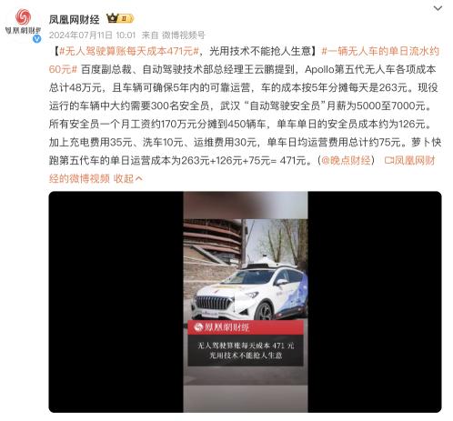 根據蘿蔔快跑在武漢運營的實際經驗,考慮到安全員輪班、線下需要運維人員、以及其他人員配置,導致實際成本和需要的人手數量甚至高於普通網約車。
