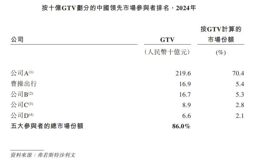 根據招股書數據,行業內按 GTV 計算的市場份額中,曹操出行只佔 5.4%。當然不難看出,曹操提供的表格裏,公司 A 到 D 分別是滴滴、T3、首汽約車和哈囉出行。