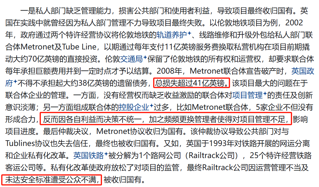 雖然篤信新自理論被打臉,但英國不敢公開説私企壟斷一樣沒效率,而是宣佈PPP升級為PFI乃至PF2,要求私企在項目中披露更多內部經營信息,同時提高政府在合同中承擔的風險降低私企漲價承諾。換句話説,承包壟斷項目的私企需要按政府或國企的模式管理,是否高效、怎麼管理的關鍵根本不在所有權性質而在是否壟斷。(當然被國企化管理的私企又沾上了英國政府的低效毛病,那就是另一個笑話了)