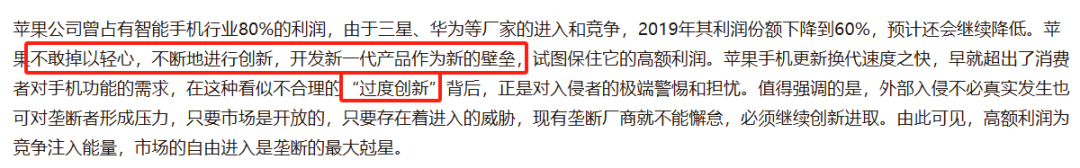 奧地利學派宣稱,“只要市場允許新競爭者自由進入,即使完全壟斷也不影響資源配置效率。”“阻止市場進入”的當然只能是政府管制,即使壟斷企業不遺餘力地打壓收購潛在競爭者,但企業家的事,怎麼能算妨礙市場呢?你看蘋果公司在多麼努力的創新,甚至都居安思危“過度創新”了呢。