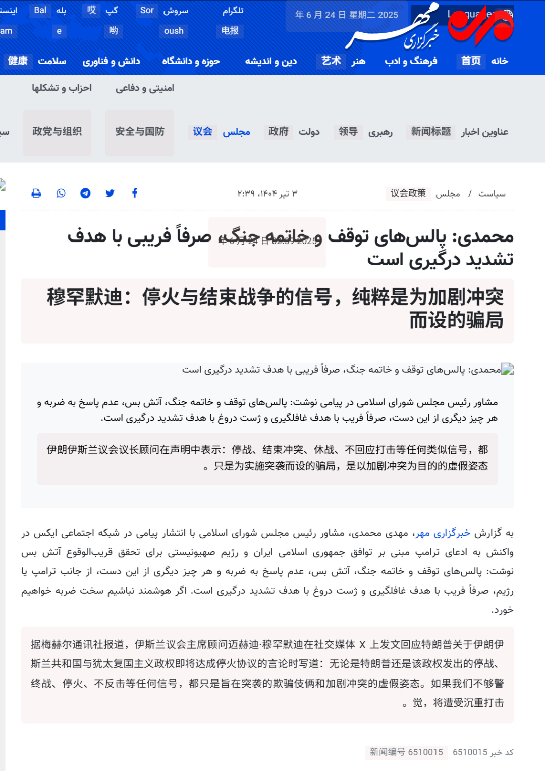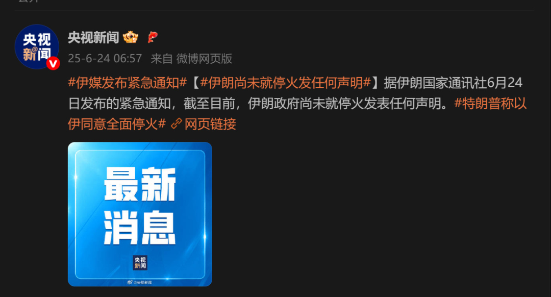 伊朗的法爾斯通訊社在北京時間七點鐘左右(德黑蘭時間凌晨2點30分),更是接連發了幾篇文章,怒罵以色列和美國的狼子野心。而伊朗議會議長強硬派卡利巴夫則在北京時間7點50左右表示,所謂的停火都是美國和以色列的詭計。