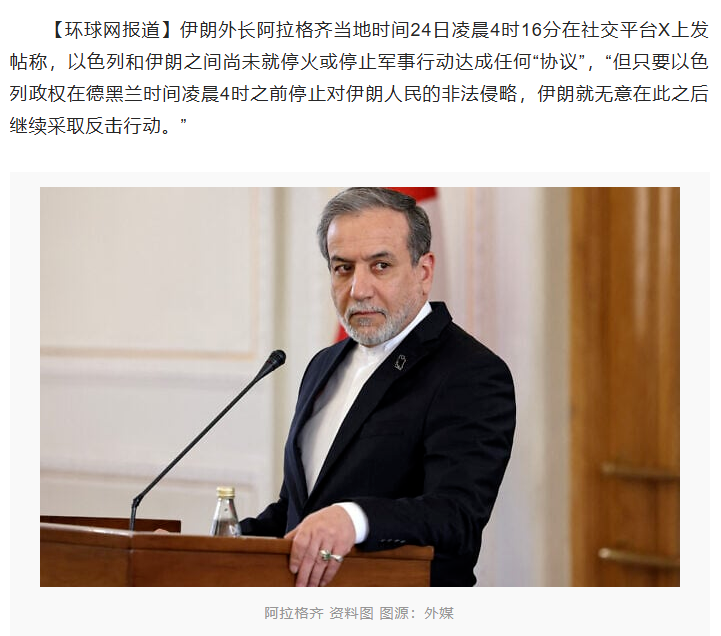 不過,最新消息是大概8點46分,伊朗外交部長阿拉格齊終於表示,只要以色列空軍在德黑蘭時間凌晨4點之前不再對伊朗實施空襲,那麼伊朗將可能停止敵對行動。實際上,以色列空軍也就是在德黑蘭時間凌晨4點(北京時間凌晨8點30分)基本上停止了對德黑蘭的空襲。