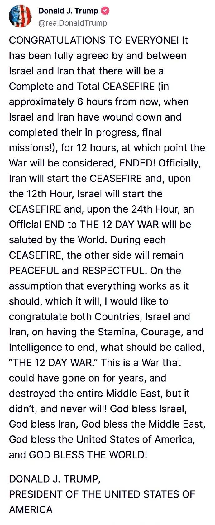 北京時間6月24日清晨6時30分許、也就是德黑蘭時間凌晨2時許,美國總統特朗普突然在自己的“真相社交”上發文,表示經過自己通過中東國家的斡旋,以色列和伊朗已經“正式宣佈停火”。