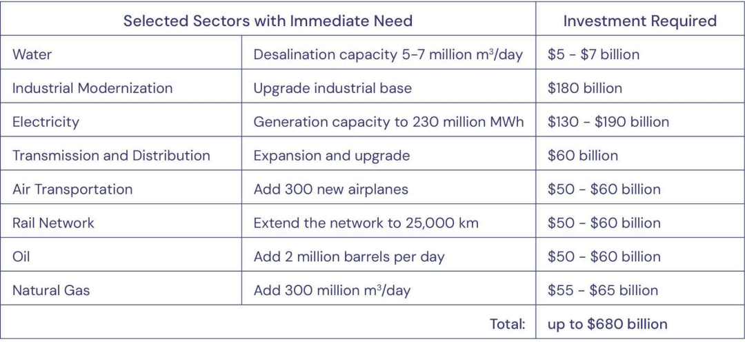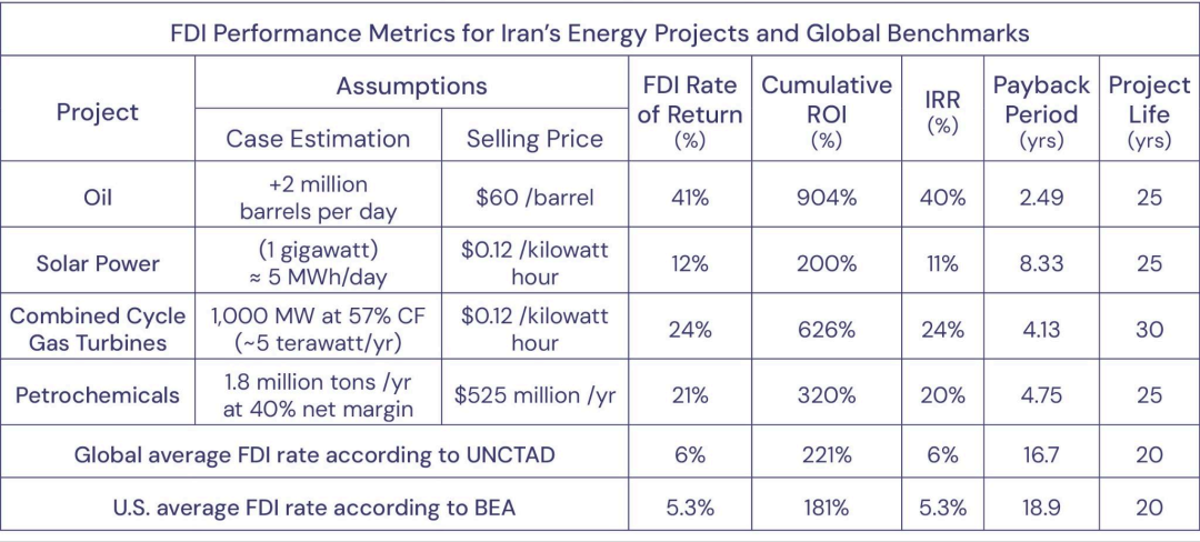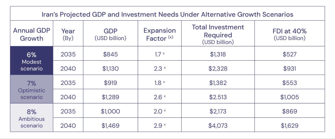 在當前的經濟制裁下,伊朗自2020年以來平均經濟增長率為4%,但由於基礎設施投資不足,該國難以維持這一增長率。若制裁取消,根據2016年麥肯錫全球研究院的一項研究顯示,伊朗的增長率可達6.3%。與此同時,伊朗政府甚至將目標定為8%,到2040年時,其國內生產總值可增加6000億至1萬億美元。為實現這一目標,伊朗到2040年時將需要約2.3萬億至4萬億美元的資本。這並非不可能,但需要依靠伊朗政府、伊朗私營部門和外國直接投資共同籌集所需資金。
